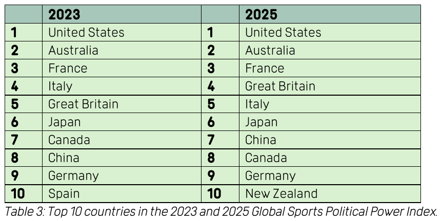 2024年巴黎奥运会表现:报告特别关注了2024年巴黎夏季奥运会奖牌榜与全球实力指数排名的关联。在巴黎奥运会上,中国以91枚总奖牌位列奖牌榜第2名。报告指出,在全球实力指数中排名靠前的国家/地区(如美国、中国、日本、澳大利亚、法国、英国、意大利、德国、新西兰),大部分也同时是2024年巴黎奥运会奖牌榜前十的国家/地区。这强化了报告的一个观察结论:更多的奥运奖牌数量通常与更强的体育政治地位相关联。中国是同时在这两个榜单中都位居前列的典型国家。